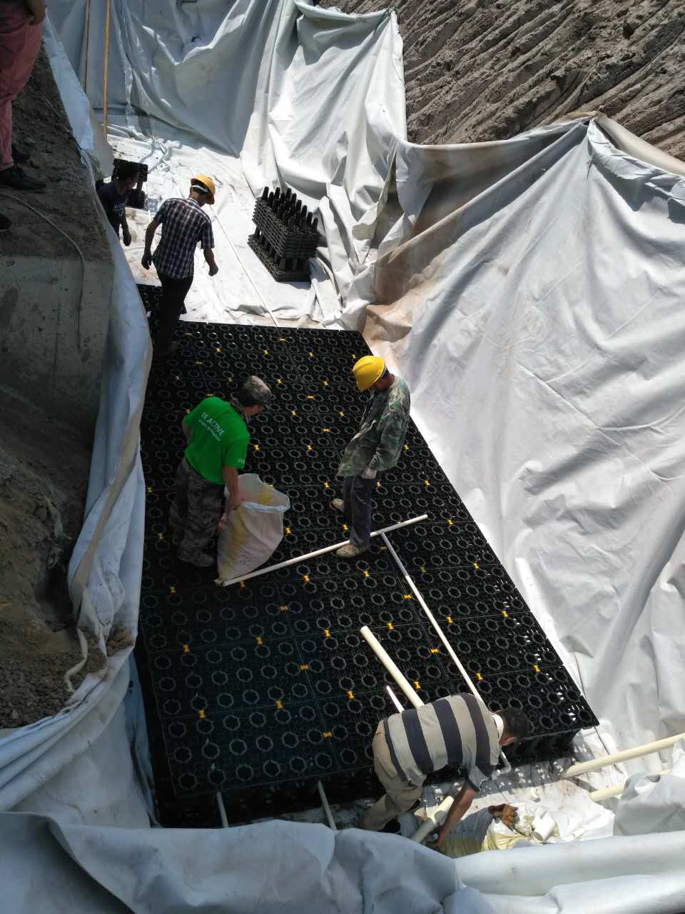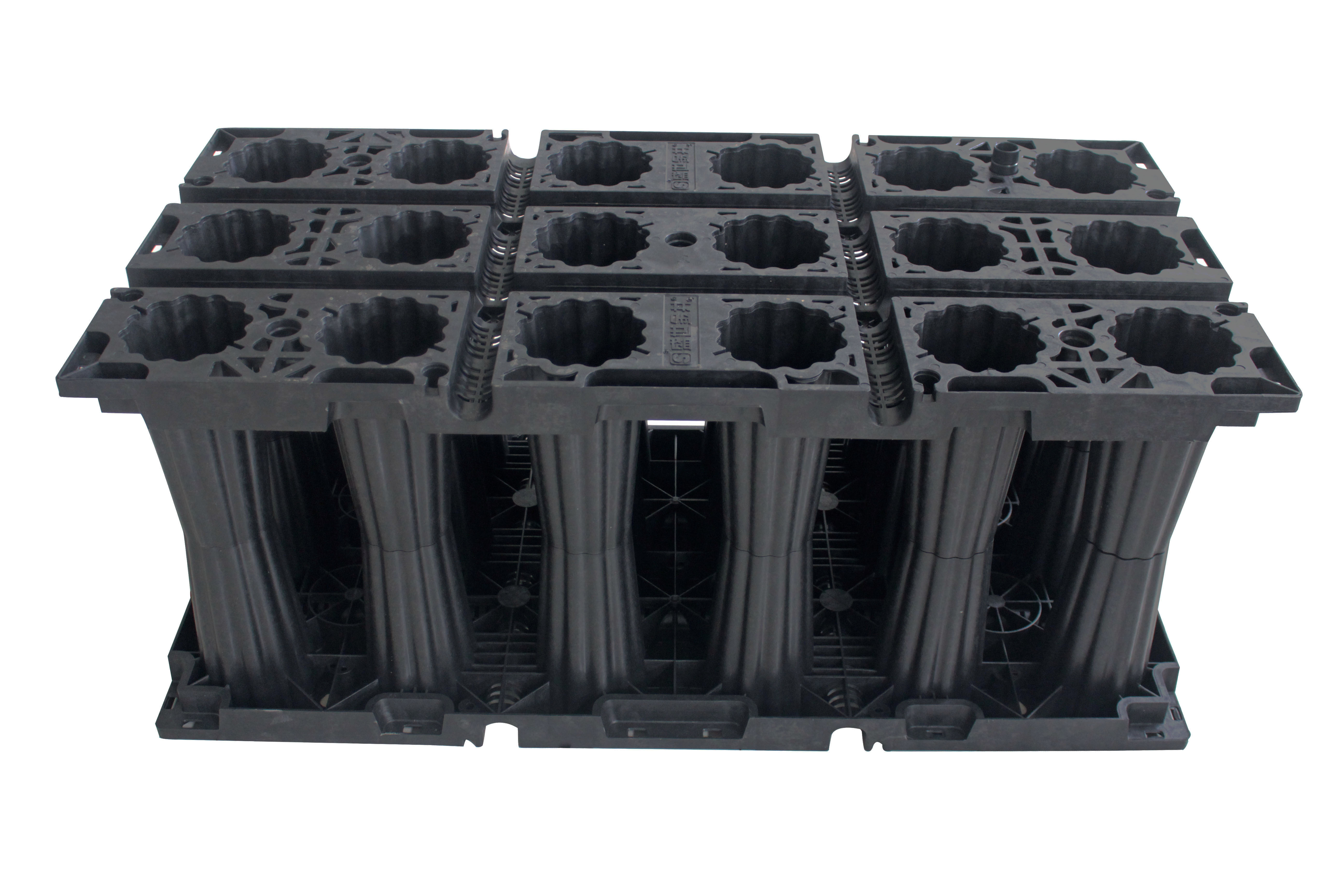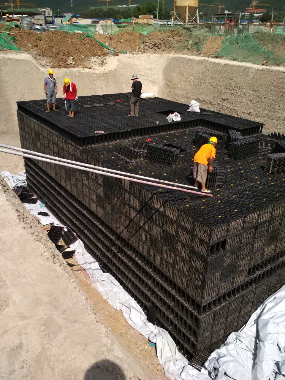 雨水蓄水模塊由相同規(guī)格尺寸的網(wǎng)格狀平板拼裝成模塊化的箱體,然后將每一個箱體碼放成為連續(xù)的雨水“矩陣”池。因為其網(wǎng)格化透空的結構,材料的結構占用空間不到5%,即模塊的蓄水空間達到95%以上,雨水可以在其中自由交換流動。